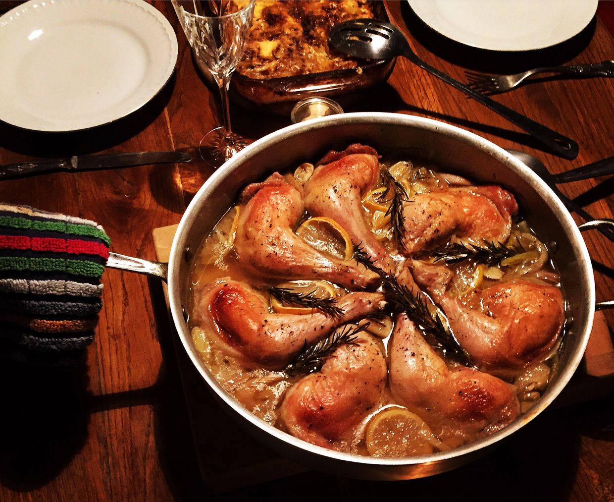 •Tuck the herbs between two of the legs, cover tightly with the lid or better yet with foil, and place in over for 1 hour.