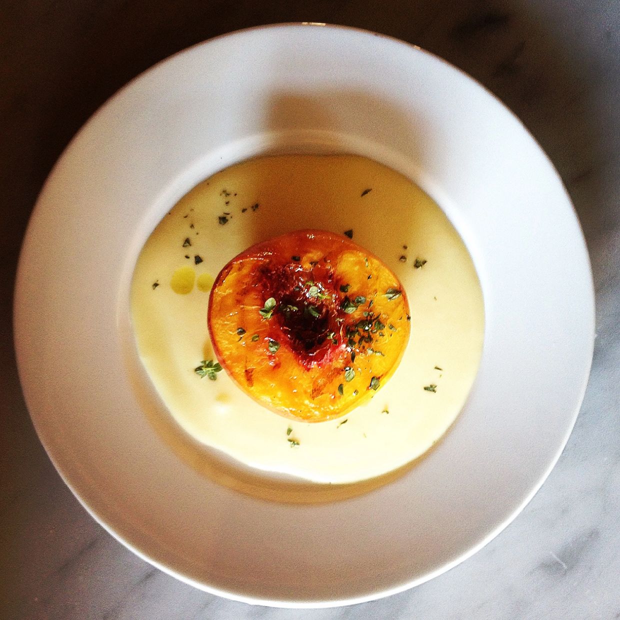 Whether as a simple base for cake, a dip for cookies or something a little different like this Grilled Peach with Fleur de Sel, Thyme and Olive Oil, crème anglaise is always a welcome touch of sweetness.