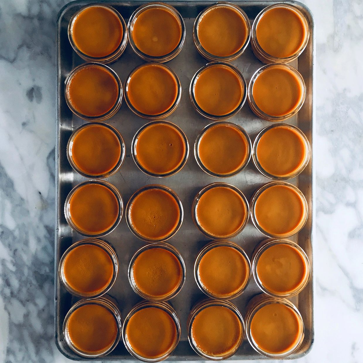 •Place six 4-ounce ovenproof ramekins or pots de creme in a 13-by-9-by-2-inch roasting pan;. Set aside.