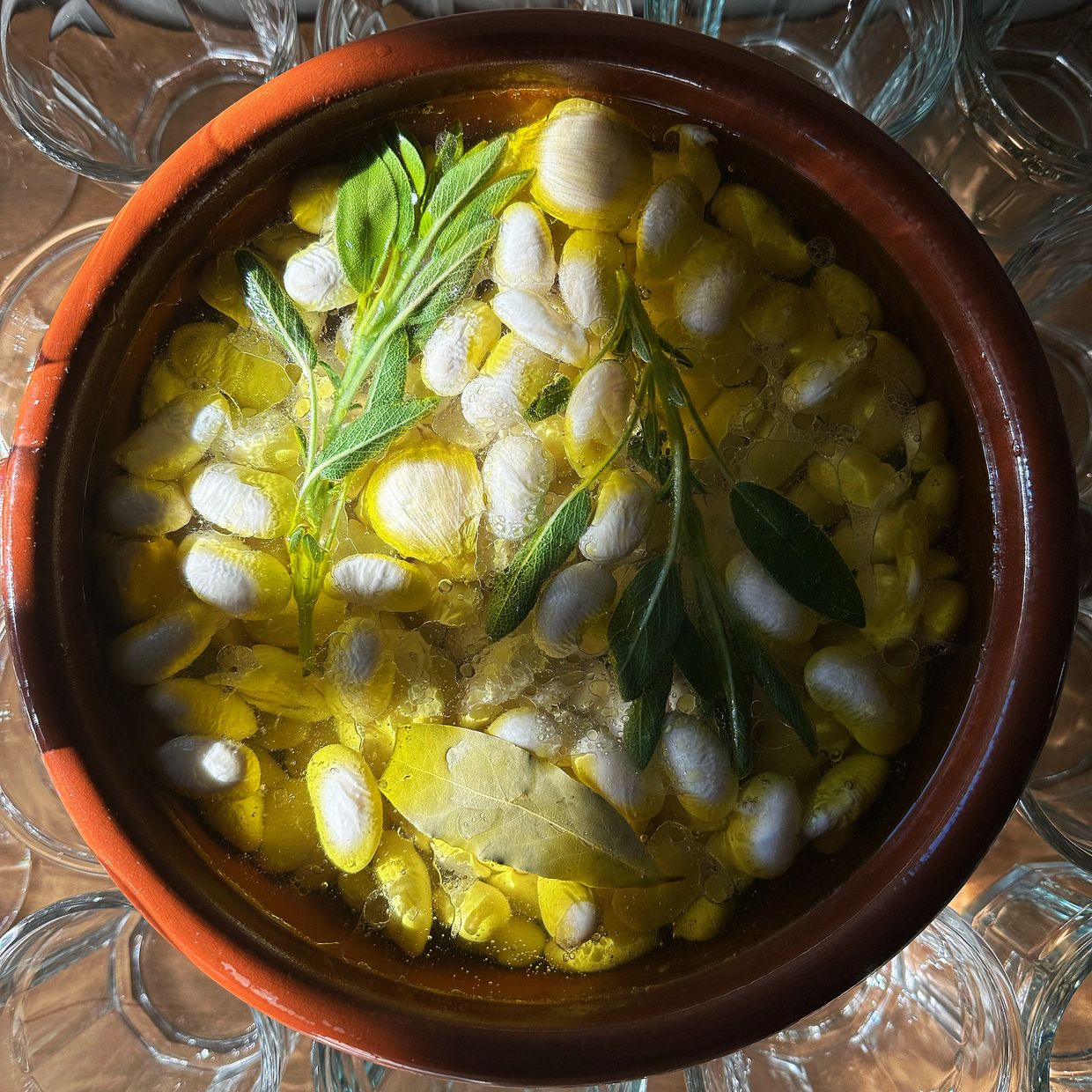 •When beans are just al dente remove from heat, discard the veg, bay and herbs.