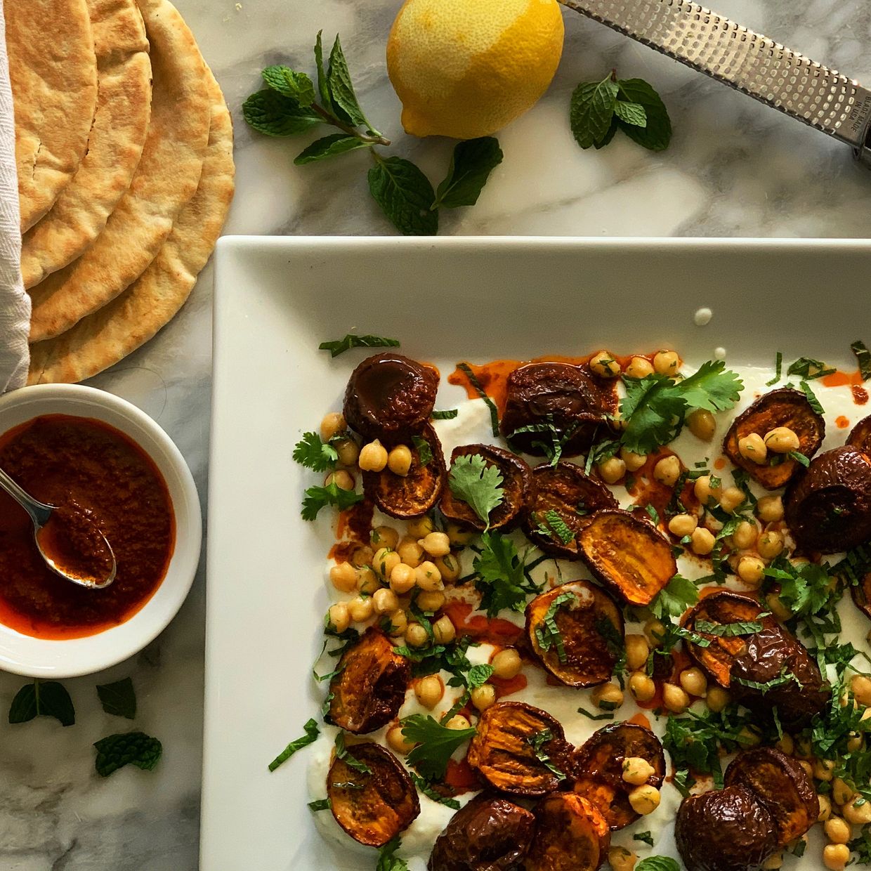 Harissa Roasted Indian Eggplant with Chic Peas and Mint on Ginger-Garlic Yogurt