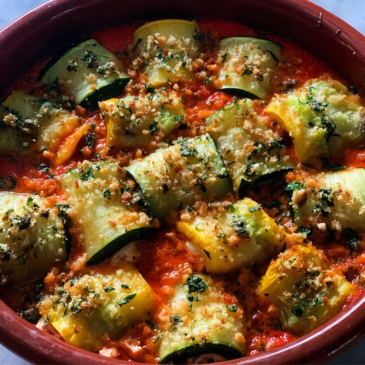 •Now, lets build these suckers! Once courgette are cool enough to handle, spoon about a teaspoon of the goat cheese on one end, then roll gently to close. Place on purée, alternating by color. Sprinkle liberally with bread crumbs. Bake until until dish is warmed through, breadcrumbs are golden.(About 20 mins.)